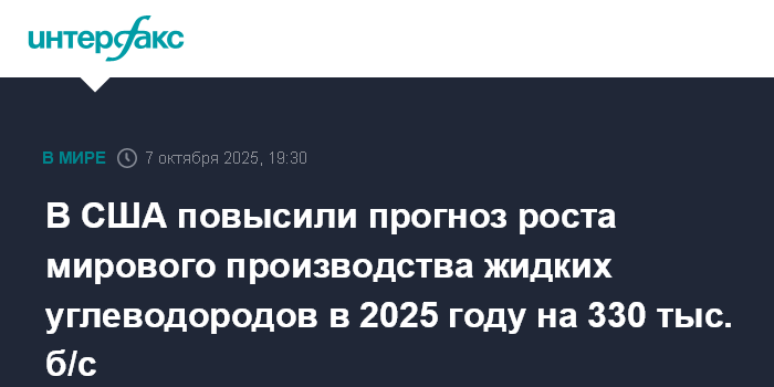 Москва. 7 октября. INTERFAX.RU - Мировое производство жидких углеводородов (ЖУВ) в 2025 году увеличится на 2,68 млн баррелей в сутки (б/с) и составит 105,87 млн б/с. Об этом сообщается в отчете управления энергетической информации Минэнерго США (EIA).