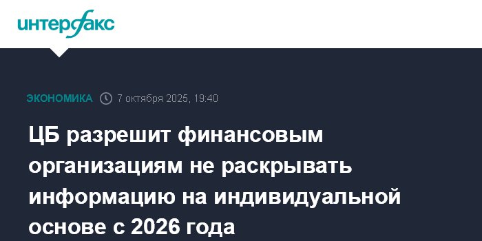 ЦБ разрешит финансовым организациям не раскрывать информацию на индивидуальной основе с 2026 года