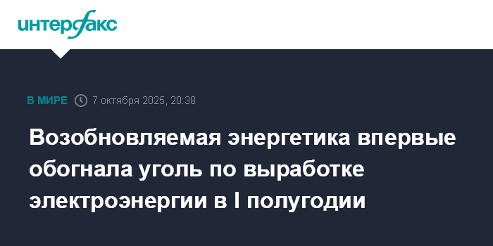 Москва. 7 октября. INTERFAX.RU - В первой половине 2025 года производство электроэнергии из возобновляемых источников, включая солнечные и ветровые электростанции, впервые в истории превысило генерацию на угольных электростанциях, пишет Reuters со ссылкой на данные аналитической компании Ember.