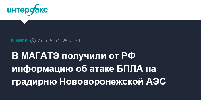 Москва. 7 октября. INTERFAX.RU - Российская сторона уведомила МАГАТЭ об атаке беспилотника в районе Нововоронежской АЭС, сообщили во вторник в международной организации.