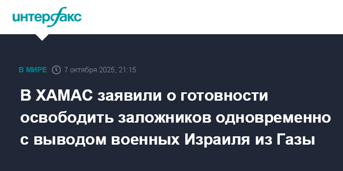 В ХАМАС заявили о готовности освободить заложников одновременно с выводом военных Израиля из Газы