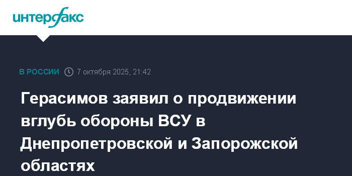 Герасимов заявил о продвижении вглубь обороны ВСУ в Днепропетровской и Запорожской областях