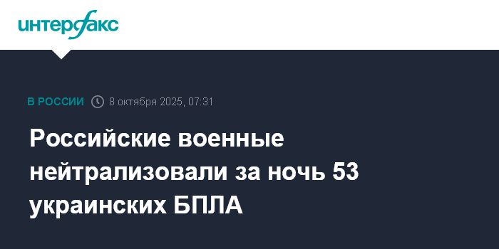 Москва. 8 октября. INTERFAX.RU - В ночь на среду российские военные перехватили и уничтожили 53 украинских беспилотника над девятью регионами РФ, сообщило Минобороны России.