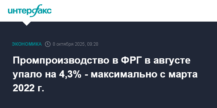 Промпроизводство в ФРГ в августе упало на 4,3% - максимально с марта 2022 г.