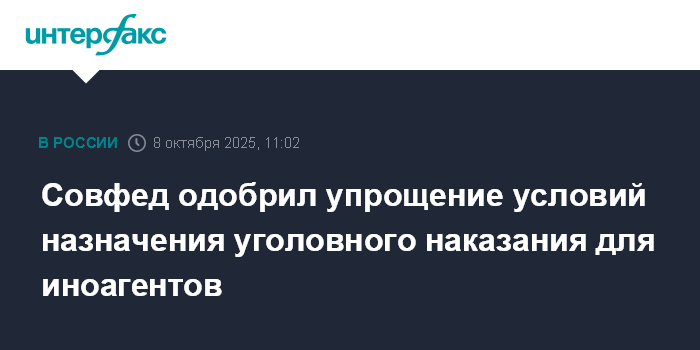 Москва. 8 октября. INTERFAX.RU - Совет Федерации на заседании в среду одобрил закон об изменении условий назначения уголовного наказания за нарушение законодательства об иностранных агентах.