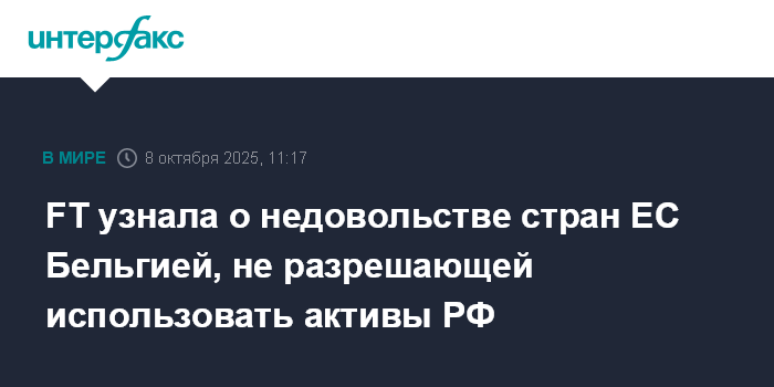 FT узнала о недовольстве стран ЕС Бельгией, не разрешающей использовать активы РФ