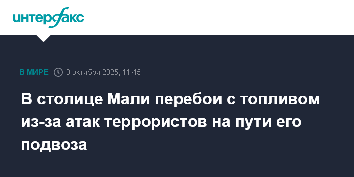 Москва. 8 октября. INTERFAX.RU - Бамако, столица Мали, с ночи на вторник столкнулась с дефицитом бензина в связи с тем, что в начале сентября группировка "Джамаат Нусрат аль-Ислам валь-Муслимин" (запрещенная в РФ террористическая организация) объявила об операции с целью сорвать доставку топлива в город, передает Associated Press (AP).