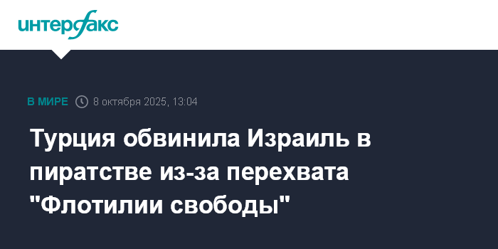 Москва. 8 октября. INTERFAX.RU - МИД Турции назвал "актом пиратства" со стороны Израиля перехват "Флотилии свободы", суда которой направлялись к сектору Газа.