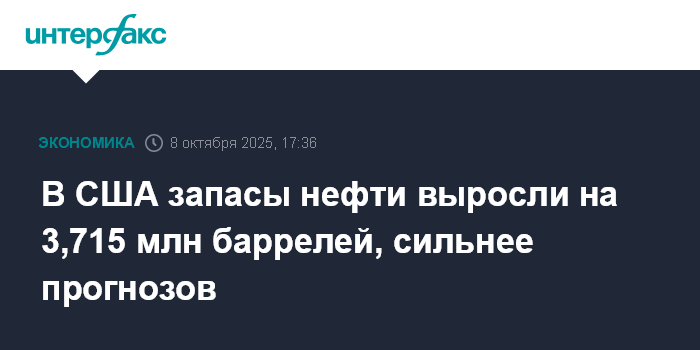 Москва. 8 октября. INTERFAX.RU - В США коммерческие запасы нефти на прошлой неделе увеличились на 3,715 млн баррелей, сообщило Минэнерго страны.