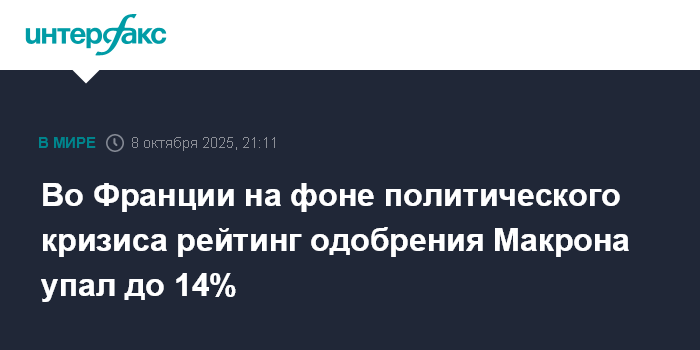 Москва. 8 октября. INTERFAX.RU - Рейтинг одобрения деятельности президента Франции Эммануэля Макрона достиг рекордно низких 14% с момента его прихода к власти, показал опрос компании Elabe для издания Les Echos. Отмечается, что этот показатель уменьшился на три процентных пункта за один месяц.