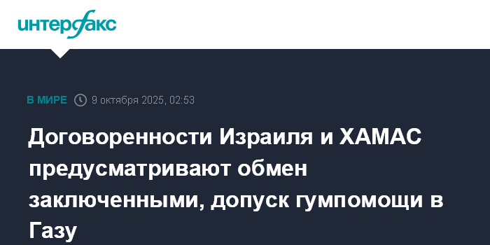 Договоренности Израиля и ХАМАС предусматривают обмен заключенными, допуск гумпомощи в Газу