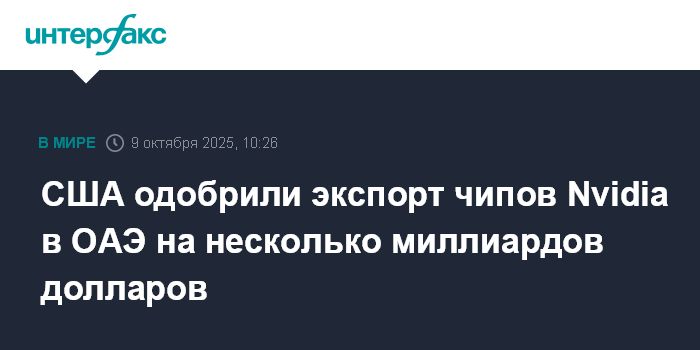 Москва. 9 октября. INTERFAX.RU - Министерство торговли США выдало экспортные лицензии на поставку чипов производства Nvidia Corp. в ОАЭ на несколько миллиардов долларов в рамках двустороннего соглашения о развитии партнерства в сфере искусственного интеллекта, пишет Bloomberg со ссылкой на информированные источники.