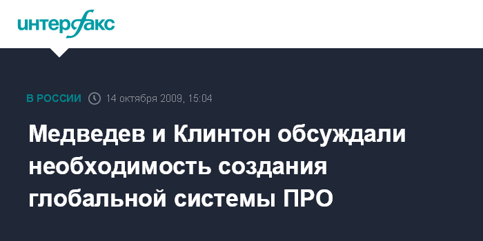 "Мы с госпожой Клинтон говорили о том, что Россия и США должны вместе работать над созданием серьезной, глобальной системы ПРО, которая не будет угрожать другим странам, но создаст серьезную защиту", - сказал Медведев на пресс-конференции после переговоров с президентом Чехии.