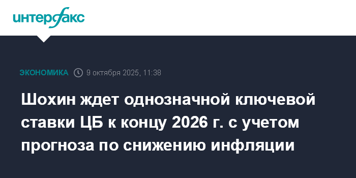 Шохин ждет однозначной ключевой ставки ЦБ к концу 2026 г. с учетом прогноза по снижению инфляции