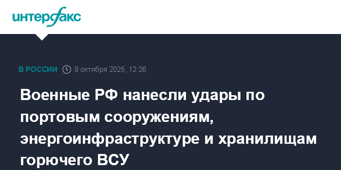 Москва. 9 октября. INTERFAX.RU - Вооружённые силы России нанесли удары по портовым сооружениям, энергетической инфраструктуре, хранилищам с горючим, обеспечивающим деятельность ВСУ, местам хранения и запуска дальних БПЛА, сообщило министерство обороны РФ в четверг.