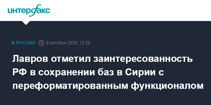 Москва. 9 октября. INTERFAX.RU - Россия хотела бы сохранить военные базы в Сирии, работа которых может быть переформатирована под новые реалии, заявил министр иностранных дел РФ Сергей Лавров.