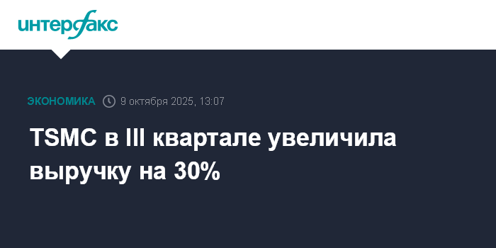Москва. 9 октября. INTERFAX.RU - Ведущий мировой производитель чипов на заказ Taiwan Semiconductor Manufacturing Company в третьем квартале увеличил выручку на 30% в годовом исчислении, до 989,92 млрд новых тайваньских долларов ($32,5 млрд), сообщается в предварительной отчетности компании.