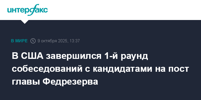 Москва. 9 октября. INTERFAX.RU - Администрация президента США Дональда Трампа завершила первый раунд собеседований среди кандидатов на пост следующего главы Федеральной резервной системы (ФРС), сообщает Financial Times со ссылкой на источники.