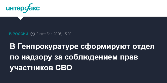 Москва. 9 октября. INTERFAX.RU - Генпрокурор РФ Александр Гуцан заявил о необходимости создания в ведомстве специализированного отдела, который займётся надзором за обеспечением прав участников СВО и членов их семей.