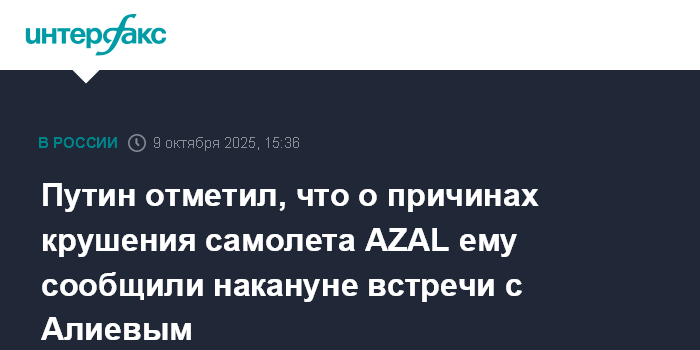 Москва. 9 октября. INTERFAX.RU - Президент РФ Владимир Путин заявил, что сообщил своему азербайджанскому коллеге Ильхаму Алиеву сведения о крушении авиалайнера AZAL, которые ему самому стали известны только в среду, а перед встречей с Алиевым глава российского государства звонил в Москву и уточнял, нет ли дополнительных деталей.