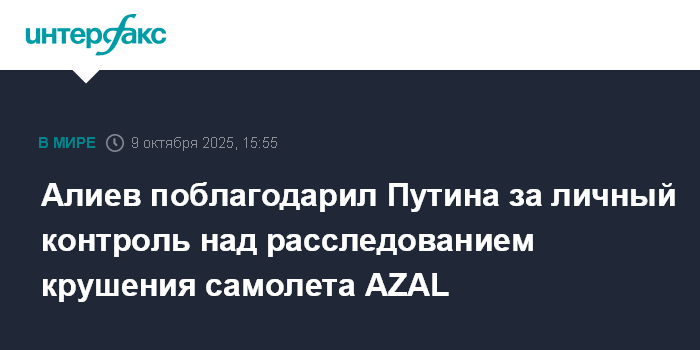 Москва. 9 октября. INTERFAX.RU - Президент Азербайджана Ильхам Алиев выразил благодарность президенту России Владимиру Путину за то, что он держит под личным контролем выяснение причин крушения самолета компании Azerbaijan Arilines 25 декабря 2024 года в Актау.