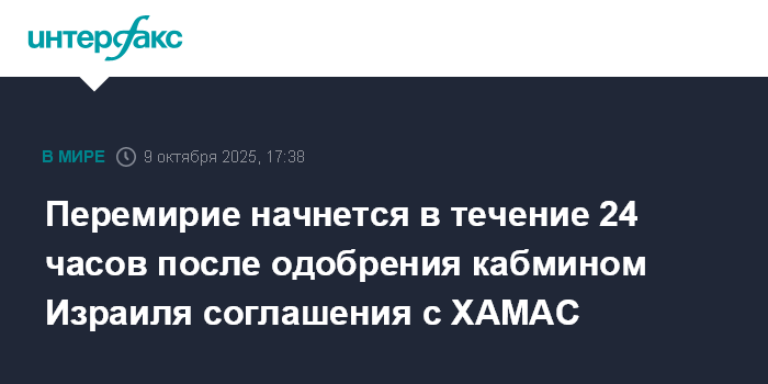 Москва. 9 октября. INTERFAX.RU - Перемирие в секторе Газа начнется в течение суток после одобрения соглашения на встрече кабинета министров Израиля, заявила в четверг представитель правительства страны Шош Бедросян.