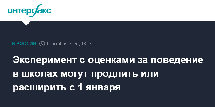 Москва. 9 октября. INTERFAX.RU - Итоги эксперимента по введению в ряде школ семи регионов России оценки за поведение будут подведены в конце 2025 года, рассматривается продление эксперимента или его расширение на все образовательные учреждения, сообщил "Интерфаксу" глава Минпросвещения РФ Сергей Кравцов.