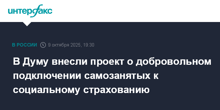 Москва. 9 октября. INTERFAX.RU - Правительство внесло в Госдуму законопроект о проведении с 1 января 2026 г. по 31 декабря 2028 г. эксперимента, который позволит самозанятым гражданам платить ежемесячно взносы в Социальный фонд РФ, чтобы в случае болезни иметь возможность получить пособие.