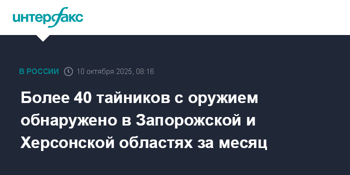 Москва. 10 октября. INTERFAX.RU - В Росгвардии сообщили об обнаружении за месяц в Херсонской и Запорожской областях более 40 тайников с оружием и боеприпасами, а также о задержании 450 человек, подозреваемых в различных нарушениях, в том числе режима военного положения.