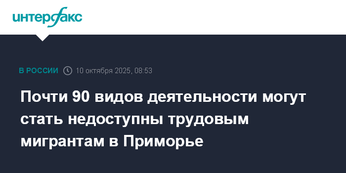 Москва. 10 октября. INTERFAX.RU - Власти Приморского края собираются с 2026 года увеличить с 36 до 89 перечень отраслей, в которых запрещено трудоустраивать иностранных работников, сообщает пресс-служба краевого правительства.