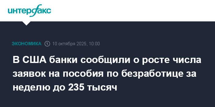 Москва. 10 октября. INTERFAX.RU - Количество американцев, впервые обратившихся за пособием по безработице, на прошлой неделе выросло до 235 тысяч с 224 тысяч неделей ранее, по оценке банков JPMorgan и Goldman Sachs.