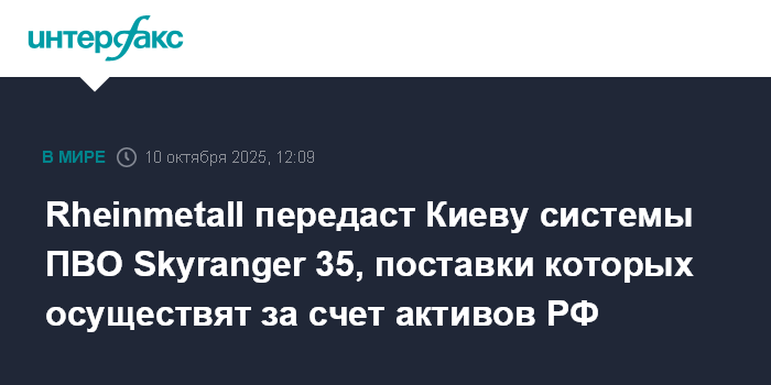 Москва. 10 октября. INTERFAX.RU - Оружейная компания Rheinmetall направит Киеву системы ПВО Skyranger 35 за счет средств, полученных от замороженных активов РФ, говорится в пресс-релизе концерна.