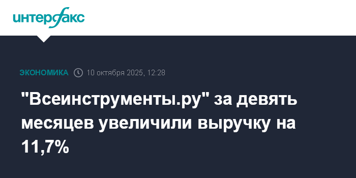 Москва. 10 октября. INTERFAX.RU - ПАО "ВИ.ру" (бренд "Всеинструменты.ру") в январе-сентябре 2025 года увеличило выручку на 11,7%, до 134,3 млрд рублей, говорится в сообщении компании.