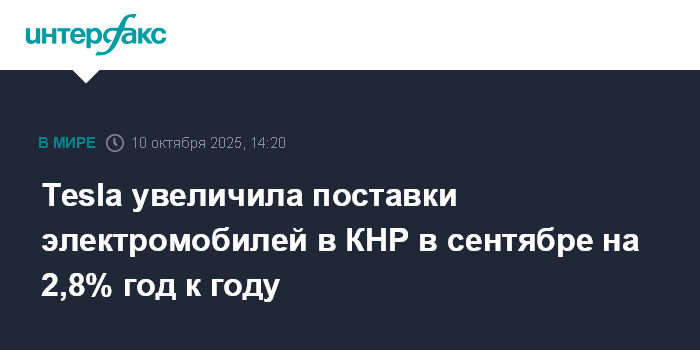 Tesla увеличила поставки электромобилей в КНР в сентябре на 2,8% год к году