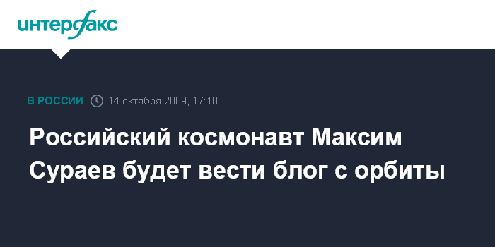 Москва. 14 октября. INTERFAX.RU - На сайте Роскосмоса открывается первый блог. Его автором станет отправившийся недавно на Международную космическую станцию (МКС) российский космонавт Максим Сураев.