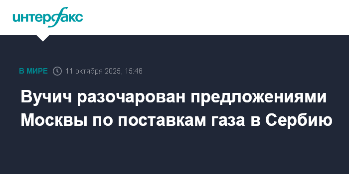 Москва. 11 октября. INTERFAX.RU - Президент Сербии Александр Вучич выразил разочарование позицией российской стороны по газоснабжению страны.
