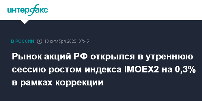 Рынок акций РФ открылся в утреннюю сессию ростом индекса IMOEX2 на 0,3% в рамках коррекции