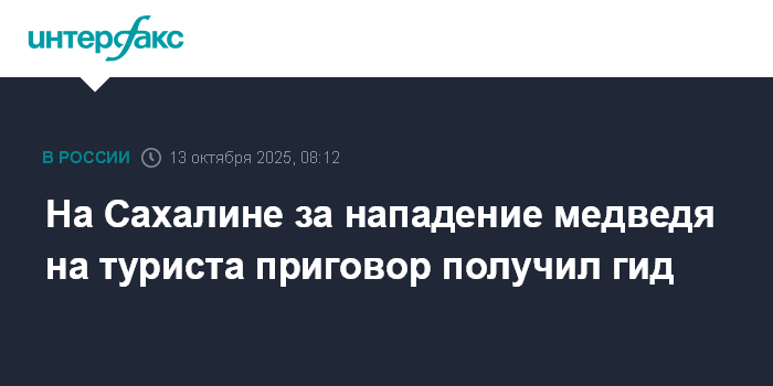 Москва. 13 октября. INTERFAX.RU - Курильский районный суд назначил гиду три года принудительных работ за организацию экскурсии, во время которой на туриста напал медведь, сообщила прокуратура Сахалинской области.