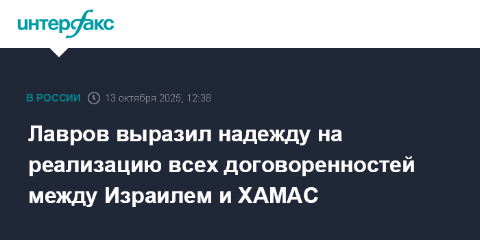 Москва. 13 октября. INTERFAX.RU - Россия рассчитывает на реализацию всех достигнутых договоренностей между Израилем и палестинским движением ХАМАС, заявил глава МИД РФ Сергей Лавров.