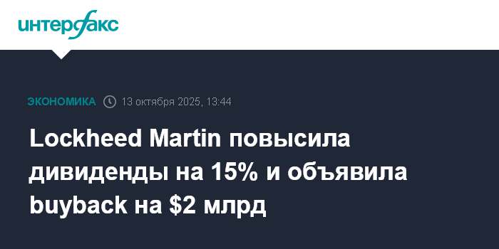 Москва. 13 октября. INTERFAX.RU - Американская военно-промышленная компания Lockheed Martin повысила размер квартальных дивидендов на 15% - до $3,45 с $3,3 на акцию, сообщила пресс-служба компании.
