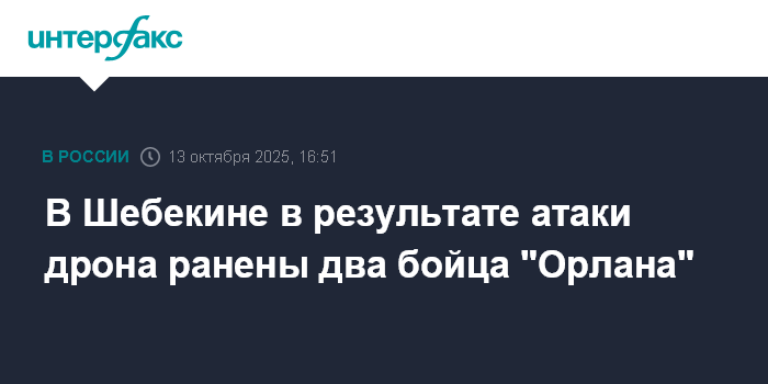 Москва. 13 октября. INTERFAX.RU - В Шебекине в результате атаки дрона ранены два бойца подразделения "Орлан", сообщил губернатор Белгородской области Вячеслав Гладков.