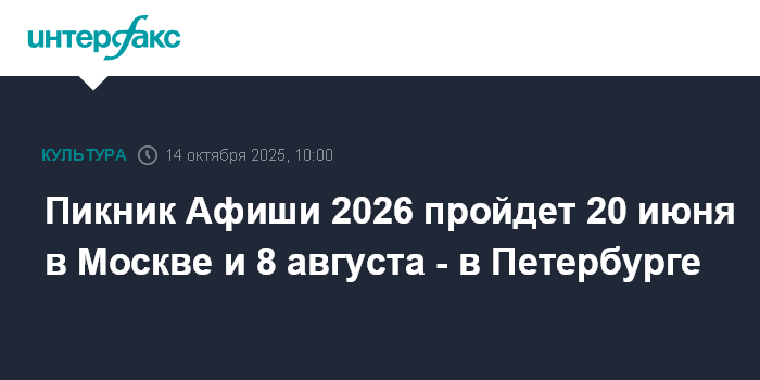 "Организаторы Пикника Афиши объявили даты главного культурного события лета. В 2026 году фестиваль вновь пройдёт в двух столицах: 20 июня – в Москве, в Коломенском, а 8 августа – в Санкт-Петербурге, на Елагином острове", - сообщили "Интерфаксу" в пресс-службе компании "Афиша".