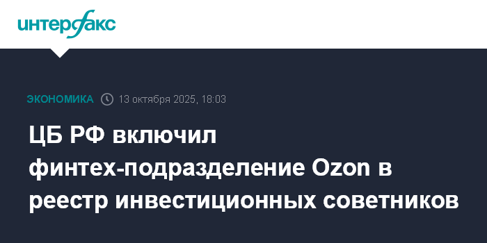 ЦБ РФ включил финтех-подразделение Ozon в реестр инвестиционных советников