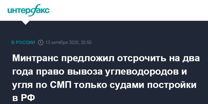 Москва. 13 октября. INTERFAX.RU - Минтранс РФ предлагает перенести на март 2028 года вступление в силу ограничений экспортных перевозок углеводородов и угля по Северному морскому пути только морскими судами, построенными на территории РФ.