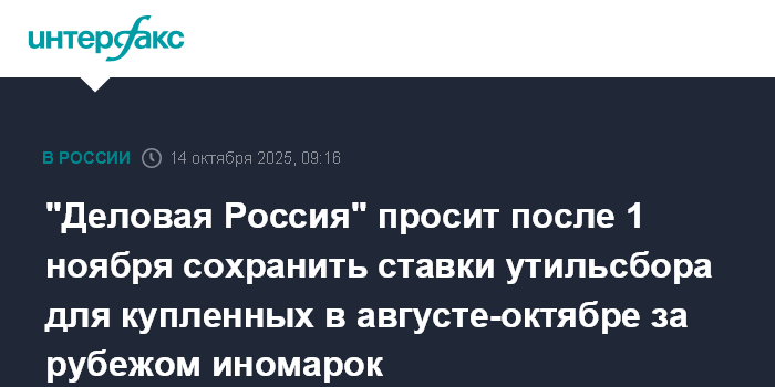 Москва. 14 октября. INTERFAX.RU - Общероссийская общественная организация "Деловая Россия" попросила вывести из-под действия новых правил исчисления утильсбора, которые могут вступить в силу с 1 ноября 2025 года, уже купленные за рубежом, но еще не ввезенные в страну до этой даты автомобили.