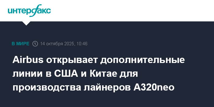 Москва. 14 октября. INTERFAX.RU - Европейская аэрокосмическая корпорация Airbus SE открывает дополнительные сборочные линии в США и Китае, чтобы увеличить производство самолетов семейства A320neo.