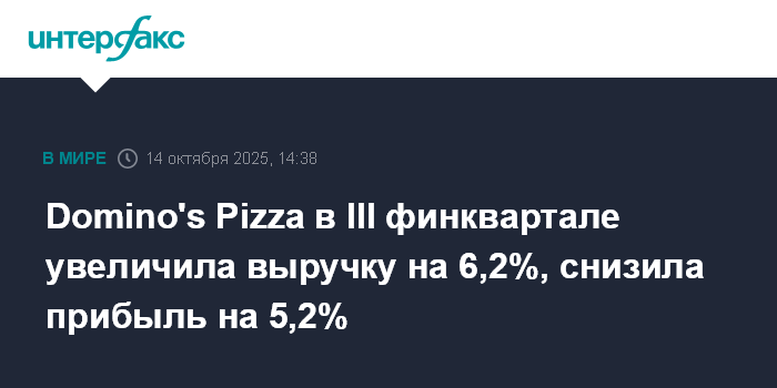 Москва. 14 октября. INTERFAX.RU - Американская сеть пиццерий Domino's Pizza Inc. в третьем квартале 2025 финансового года нарастила выручку на 6,2%, но сократила чистую прибыль на 5,2%, при этом оба показателя оказались лучше прогнозов аналитиков.