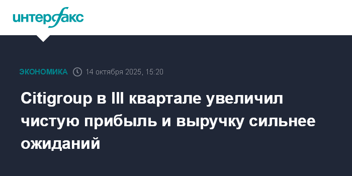 Москва. 14 октября. INTERFAX.RU - Citigroup Inc., входящий в число крупнейших банков США, в третьем квартале 2025 года увеличил чистую прибыль на 15,9% при росте выручки на 9,3%.
