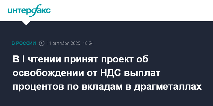 Москва. 14 октября. INTERFAX.RU - Госдума приняла в первом чтении законопроект, который освобождает от НДС выплату процентов по вкладам в драгоценных металлах в слитках, также уточняется порядок применения льготы по НДС в отношении операций по выдаче банком займа в драгоценных металлах.