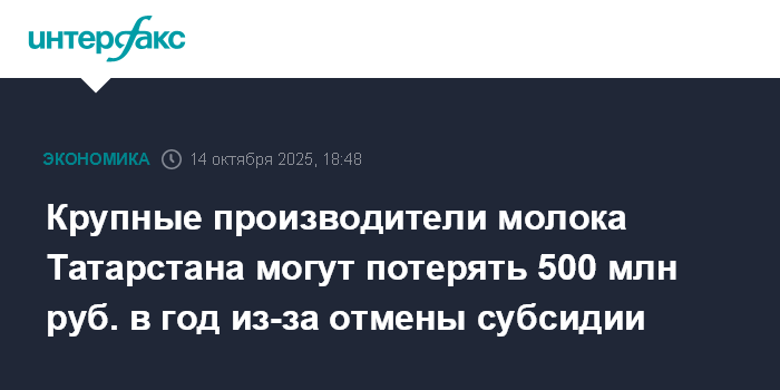 Москва. 14 октября. INTERFAX.RU - Татарстанские производители молока рискуют потерять около 500 млн рублей в год из-за отмены субсидии на его реализацию для крупных предприятий. Об этом сообщил глава Минсельхозпрода республики Марат Зяббаров на брифинге в Казани во вторник.